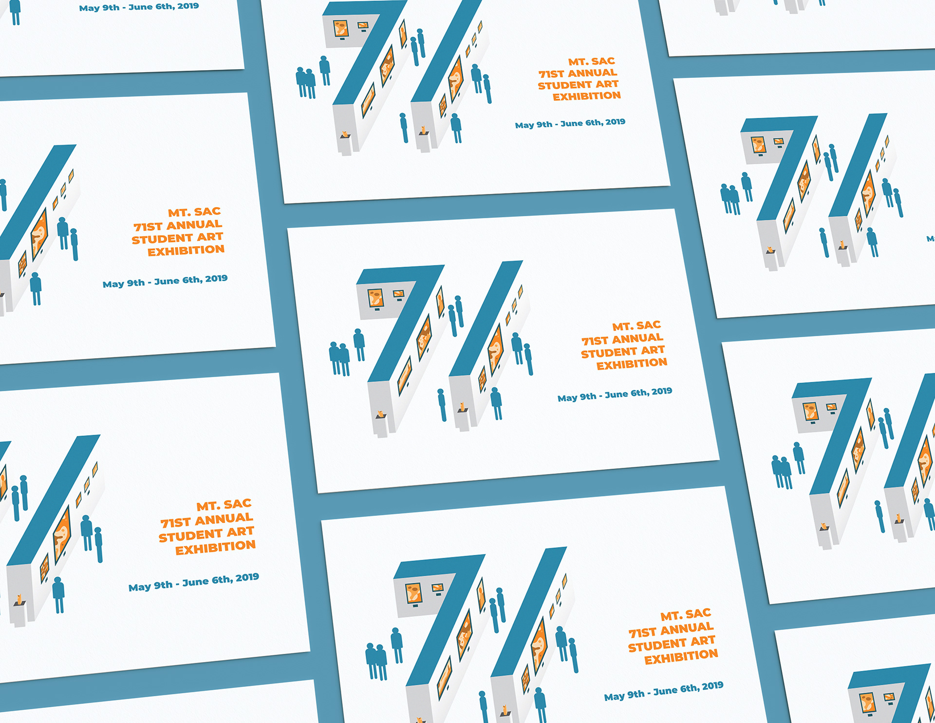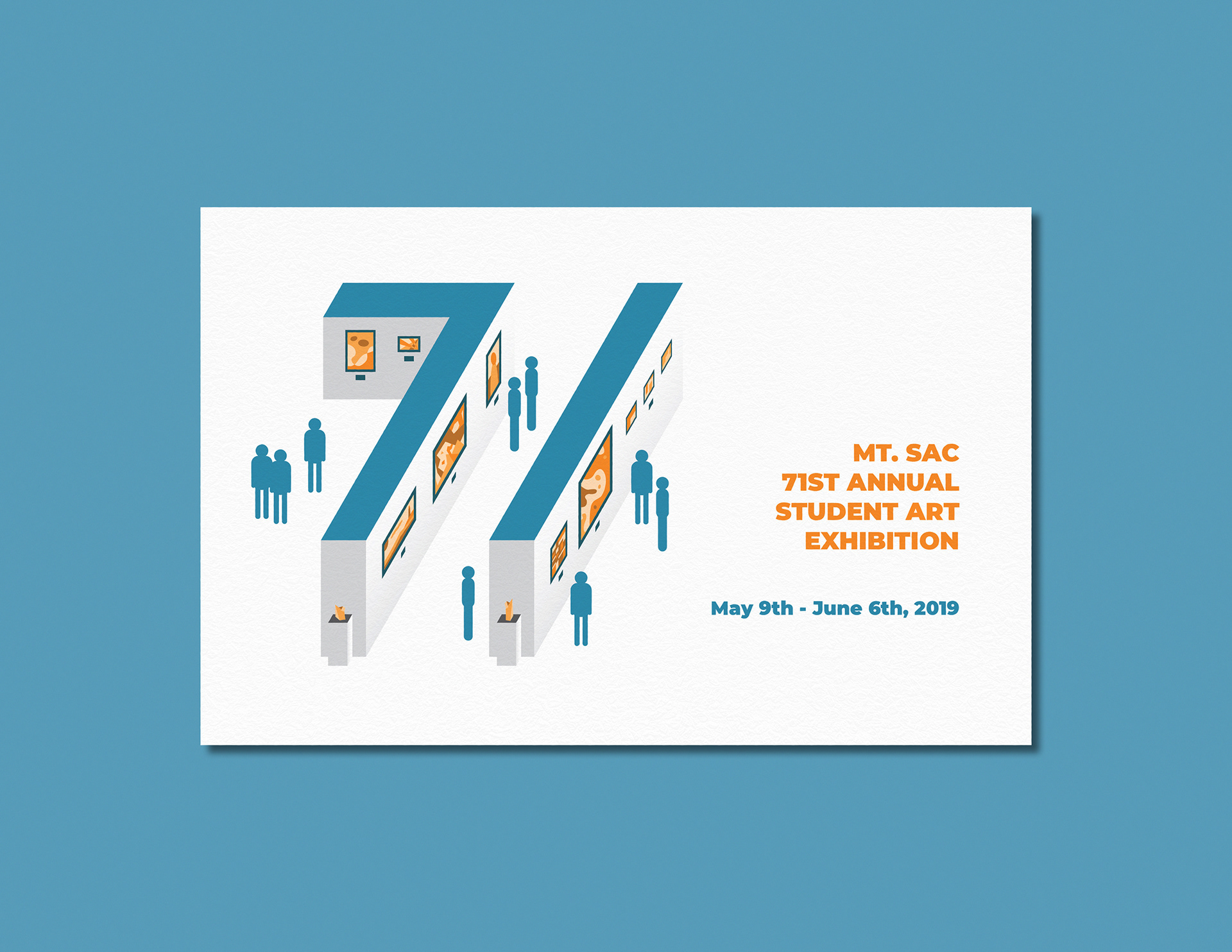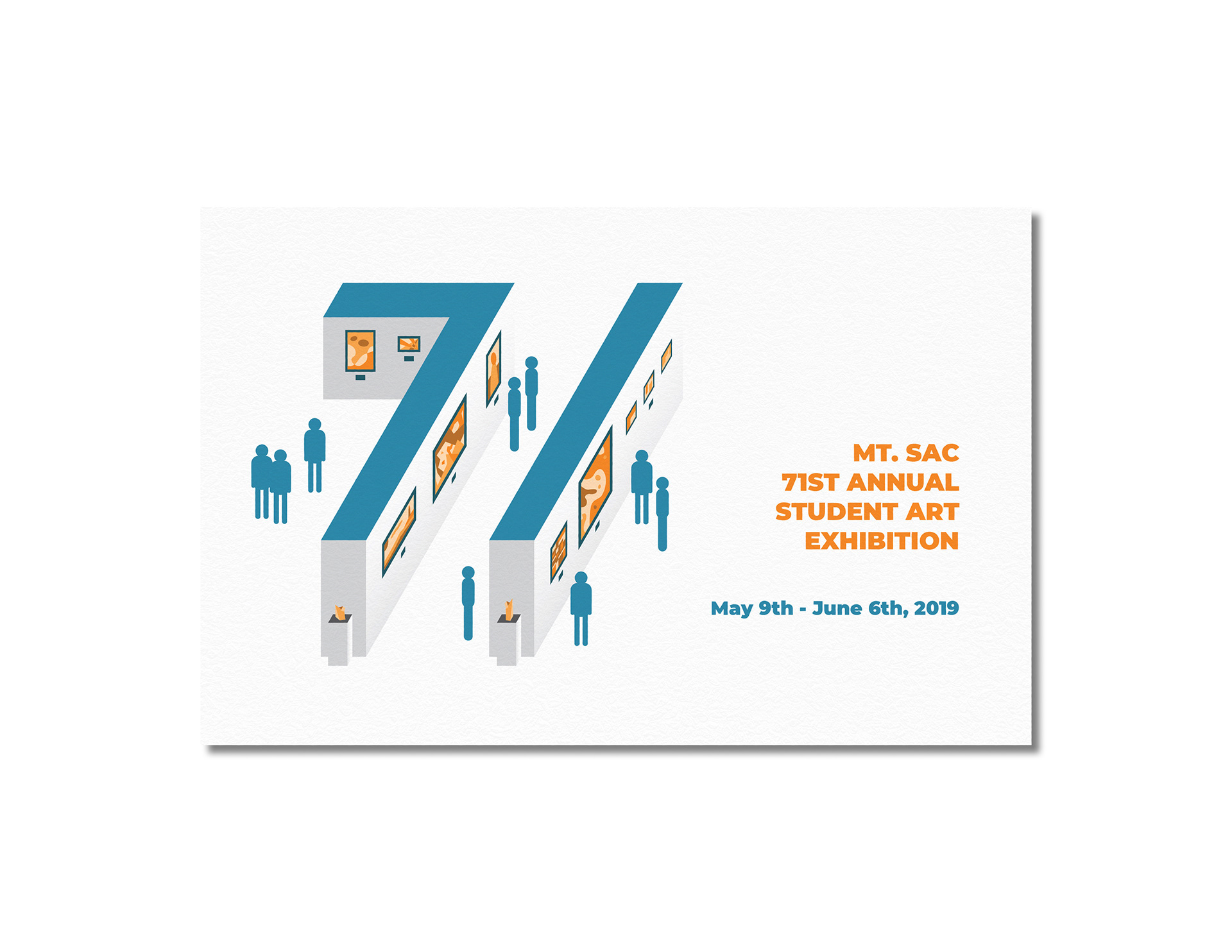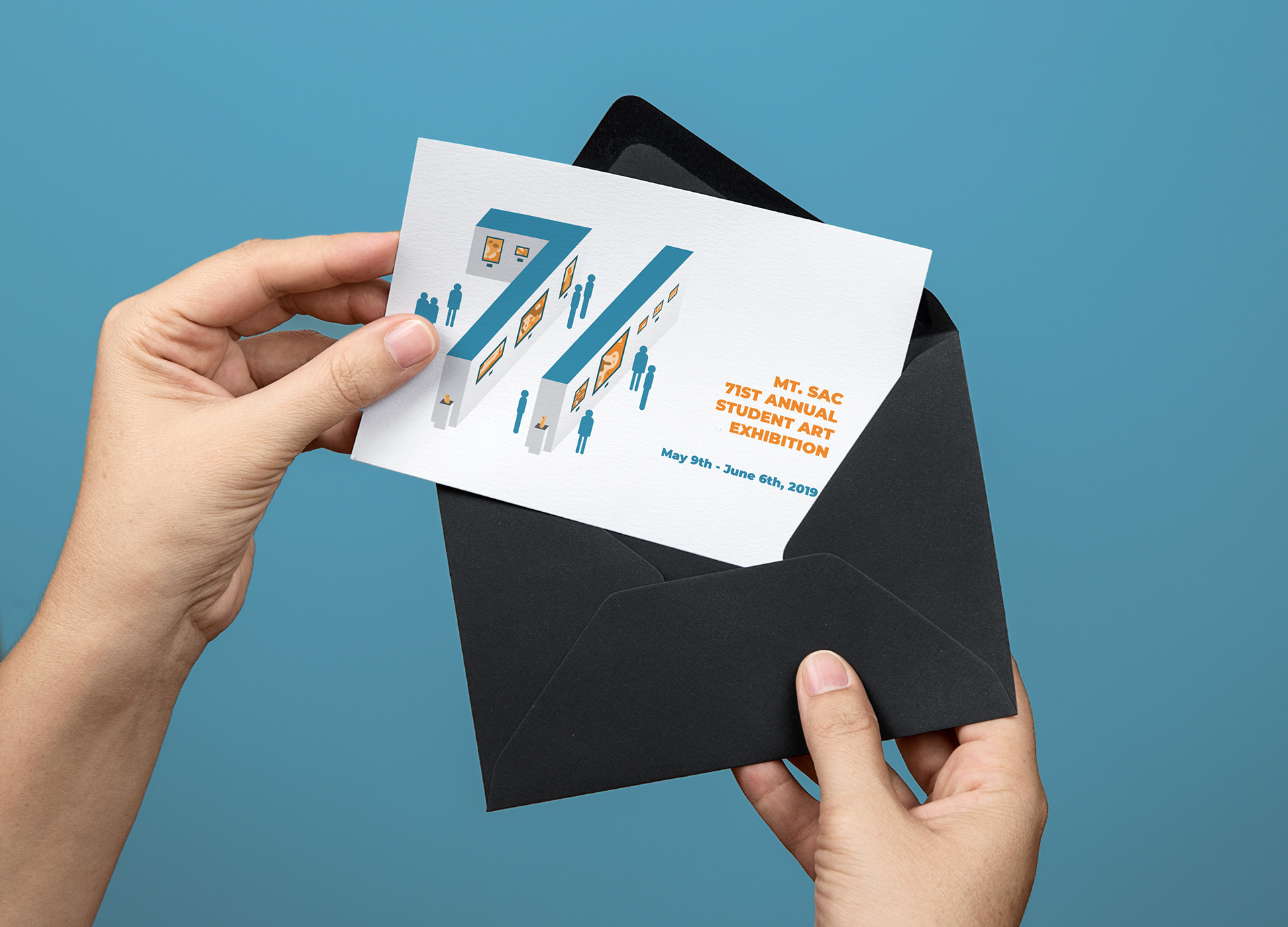 Flyer and mailer card advertisement for Mt. San Antonio College's 71st Annual Student Art Exhibition in Walnut, California.