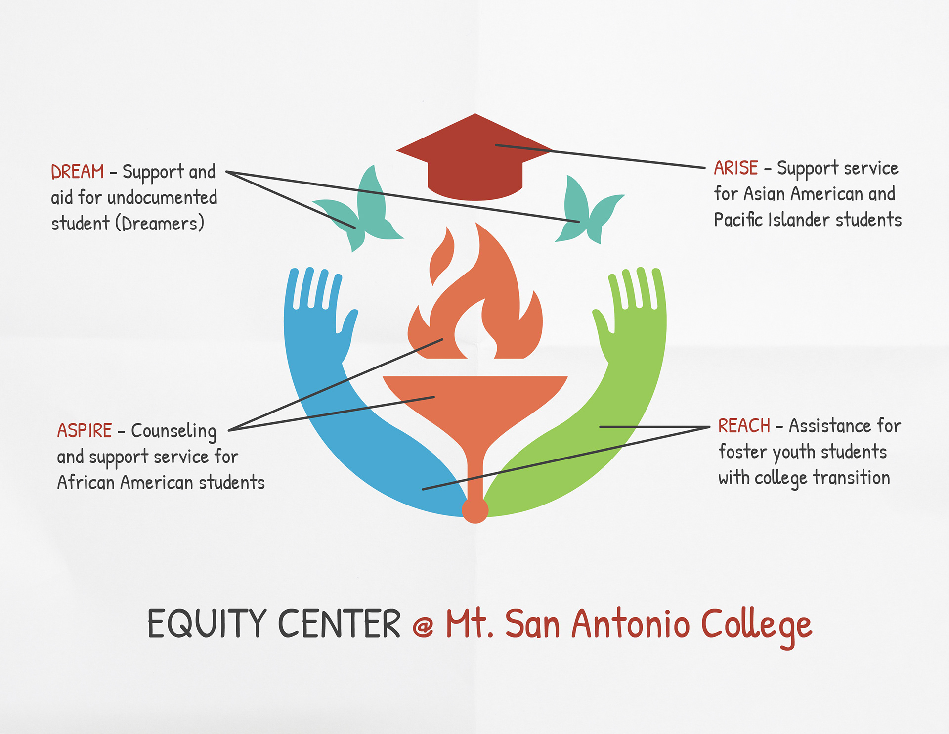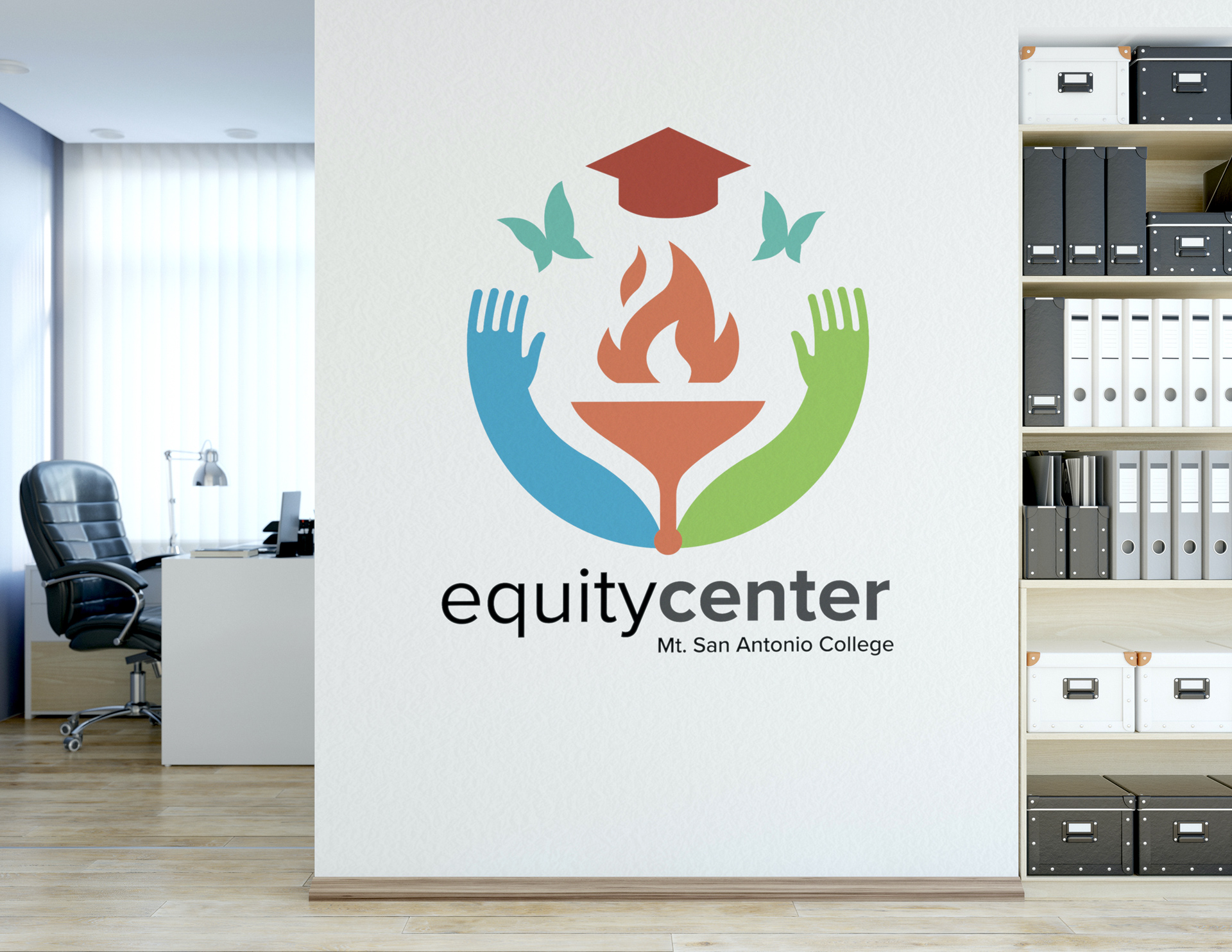 Logo designed for the Equity Center at Mt. San Antonio College in Walnut, California. Elements in the logo reflect the four departments housed in the center and the under-represented minority groups which they stand for.
