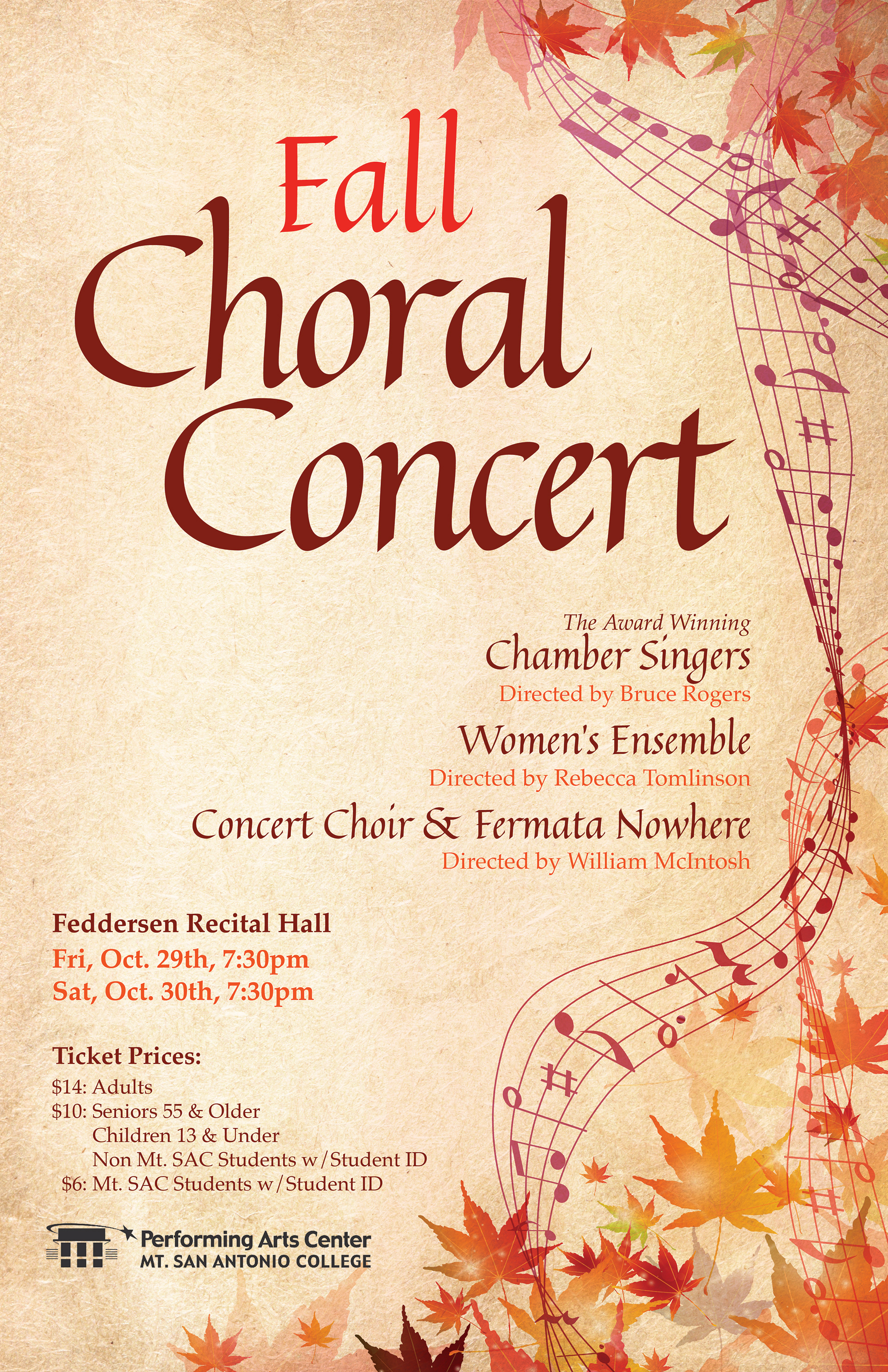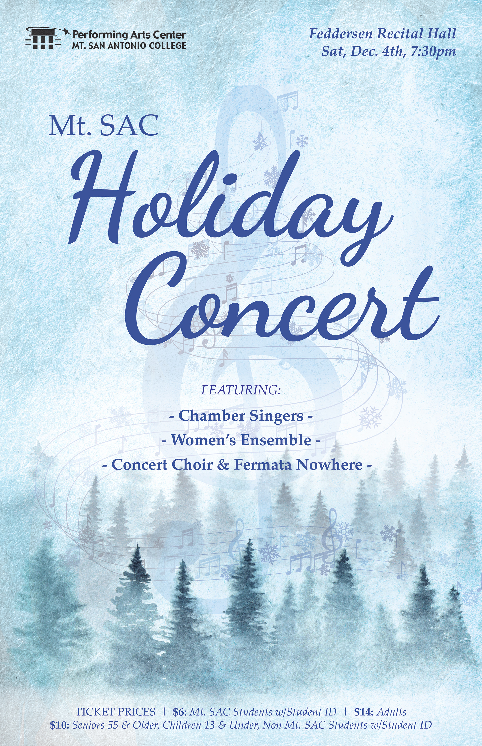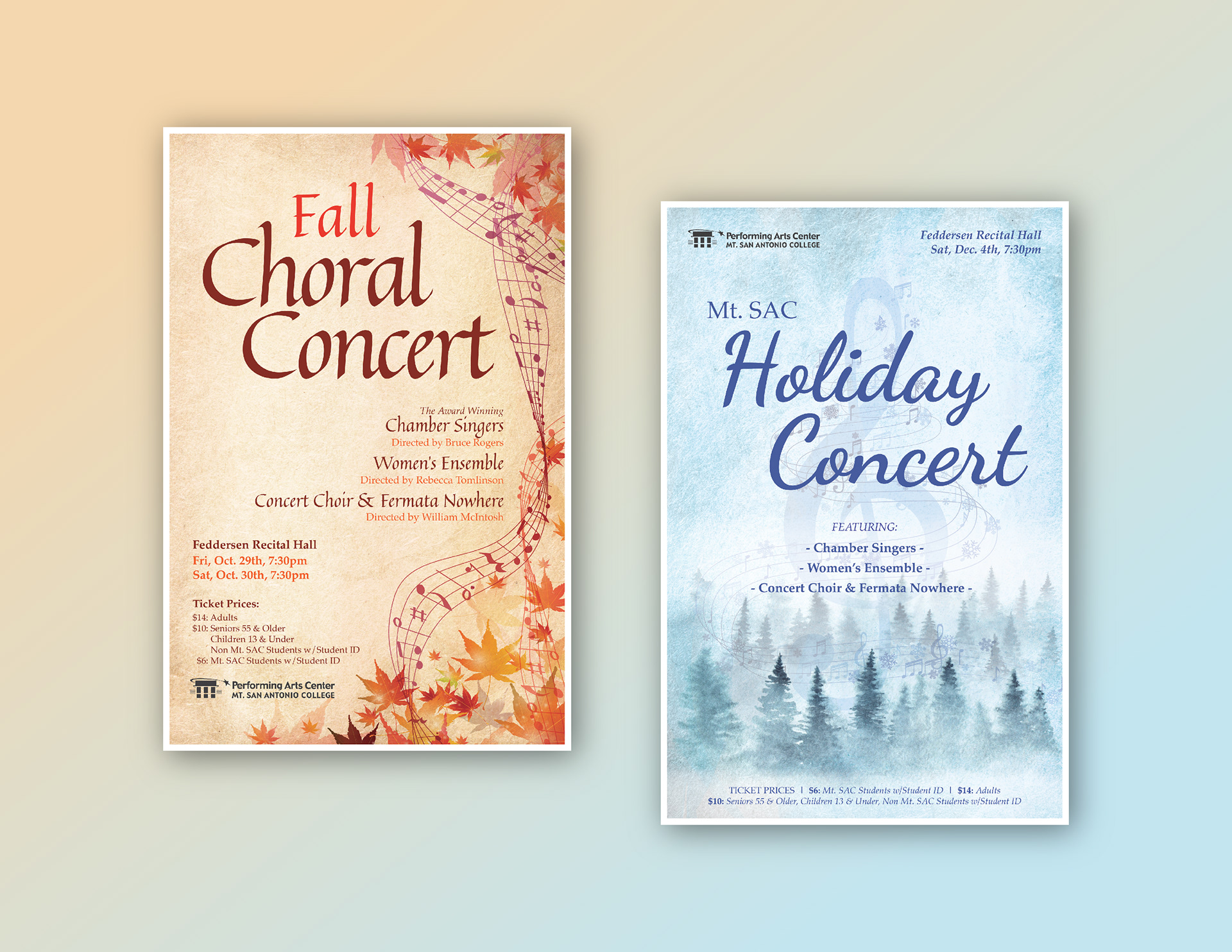 Community posters for Mt. San Antonio College's seasonal choral concerts featuring the Chamber Singers, Women's Ensemble, and the Concert Choir & Fermata Nowhere.